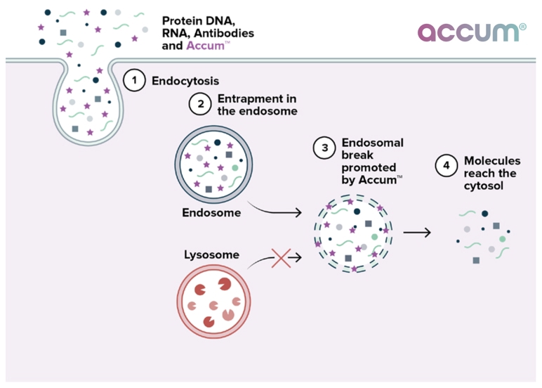 Wissenschaftlich betrachtet ist Accum® kein Medikament im klassischen Sinne, sondern ein rational entwickelter molekularer Zusatz, der gezielt darauf ausgelegt ist, die intrazelluläre Verteilung komplexer biologischer Wirkstoffe zu optimieren. Die Technologie adressiert eines der zentralen, bislang nur unzureichend gelösten Probleme moderner Krebstherapien: die effiziente Überwindung zellulärer Barrieren und die gezielte Freisetzung der therapeutischen Payload an ihrem Wirkort innerhalb der Zelle, insbesondere in der Nähe des Zellkerns.