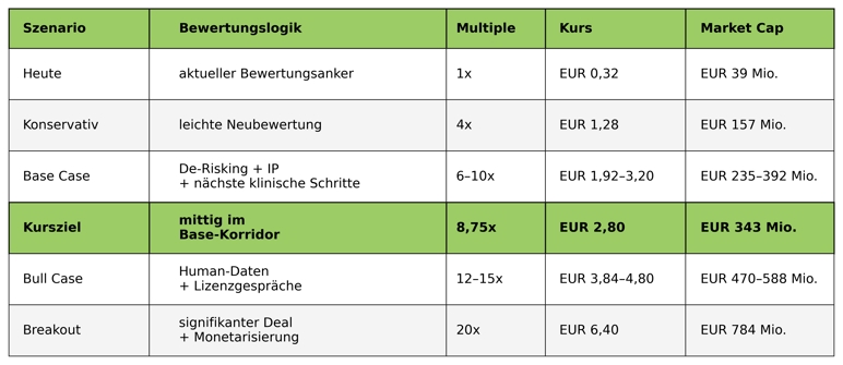 Kommen wir zur Zahl, die den Unterschied zwischen Lesen und Handeln ausmacht. EUR 0,32 aktueller Kurs gegenüber EUR 2,80 Kursziel bedeutet ein Kurspotenzial von über 700 Prozent, also rund 8x. Das klingt extrem, aber genau deshalb sind Neubewertungsphasen in Biotech so brutal. Der Markt bewertet nicht linear. Er bewertet in Sprüngen. Wenn sich die Wahrnehmung von möglich zu plausibel verschiebt, reichen wenige Katalysatoren, um Bewertungsanker neu zu setzen. Die Minipig-Studie ist ein Validierungssignal. Der Patentstatus ist der Schutzhebel. Der Rest ist Nachrichtenfluss und Partnerschafts- und Lizenzfantasie auf Basis harter Daten.